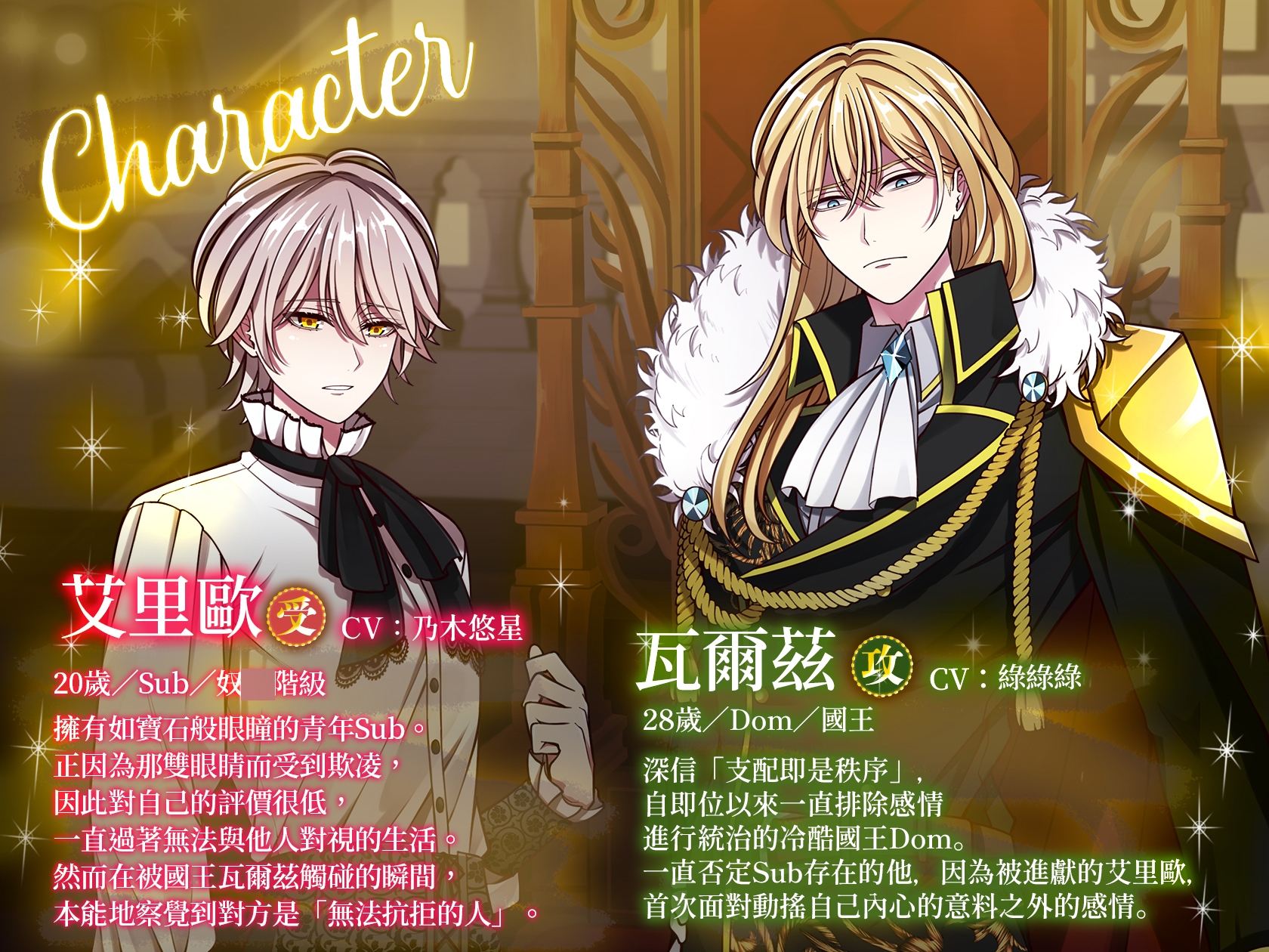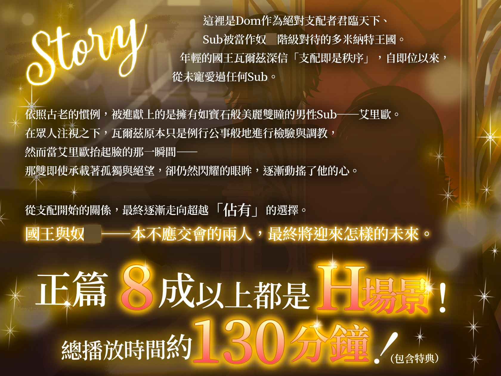 Sub被當作奴◯階級對待的多米納特王國。年輕的國王瓦爾茲深信「支配即是秩序」,自即位以來,從未寵愛過任何Sub。依照古老的慣例,被進獻上的是擁有如寶石般美麗雙瞳的男性Sub──艾里歐。在眾人注視之下,瓦爾茲原本只是例行公事般地進行檢驗與調教,然而當艾里歐抬起臉的那一瞬間―― 那雙即使承載著孤獨與絕望,卻仍然閃耀的眼眸,逐漸動搖了他的心。從支配開始的關係,最終逐漸走向超越「佔有」的選擇。CV緑緑緑×乃木悠星