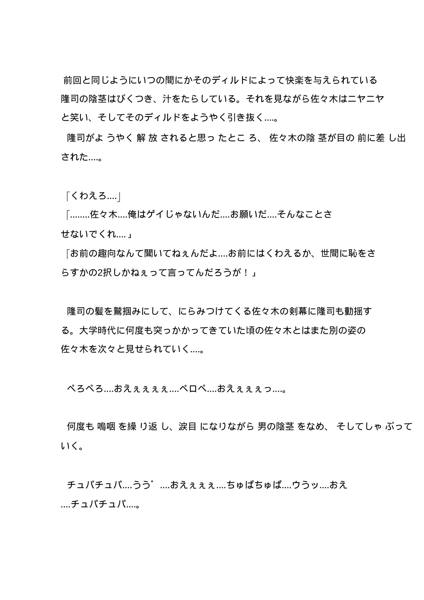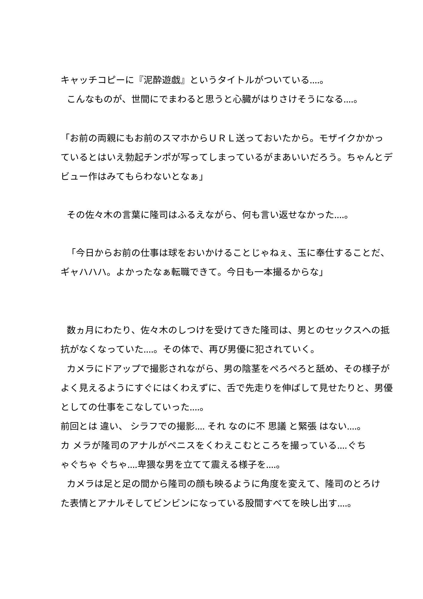 18禁小説です。 プロ野球選手が薬を盛られて痴態を撮られ、それをネタに脅されながらAV男優としてデビューさせられてしまうという設定です。 バイブ責め、撮影、ブリーフ、浣腸、旧友への晒し、モブ〇、スカトロ描写等