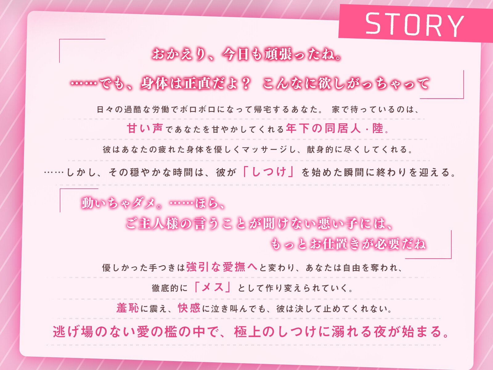 【献身ヒモ×豹変執着】「俺がいないと、もう何もできない身体にしてあげる」献身的に尽くしてくれる年下の同居人・陸。癒やしのマッサージはいつしか淫らな「クリしつけ」へと変わり、屈辱的な喘ぎ真似と執拗な急所攻めで、心も身体も屈服させられていく。普段の甘い笑顔から一変、容赦なく調教する彼の独占欲に溺れる夜。快感と恥じらいの果て、あなたは彼なしではいられない身体に作り変えられる――。