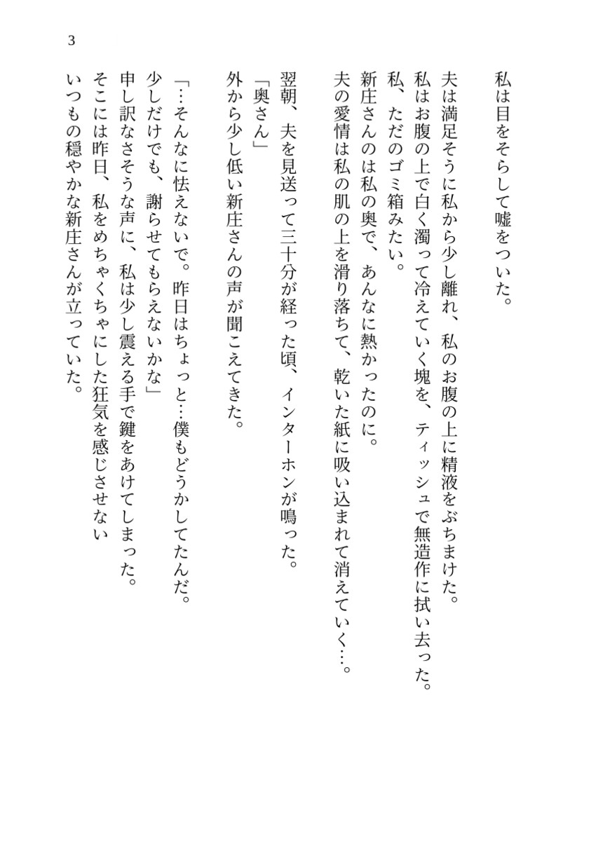 夫との空虚な行為を新庄に上書きされ、ついに自ら「入れて」と懇願し、隣人のモノを自ら飲み込んでしまう。