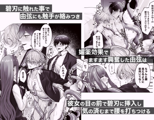 触手、フェラ、首絞め、彼女の前で無理矢理、中出し