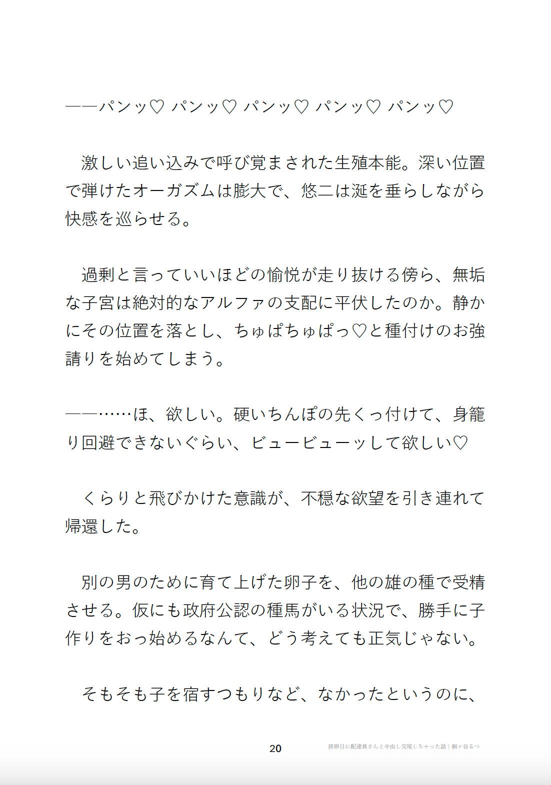 そこはオメガが絶滅の危機に瀕し、男型ベータに『出産の義務』が課せらた世界。種馬役に選ばれた友人のため、孕ませ薬で子宮を作ったが、なかなか連絡が繋がらない。返信を待つ間にも身体の変化は進み、ついに排卵日を迎えてしまう。受精準備の整った子宮が不穏な疼きを覚える中、主人公の元へフードデリバリーの配達員が訪れる。「……あいつのために育てた卵子、俺に食われちゃって可哀想だね」【フードデリバリーの配達員×カントボーイ】