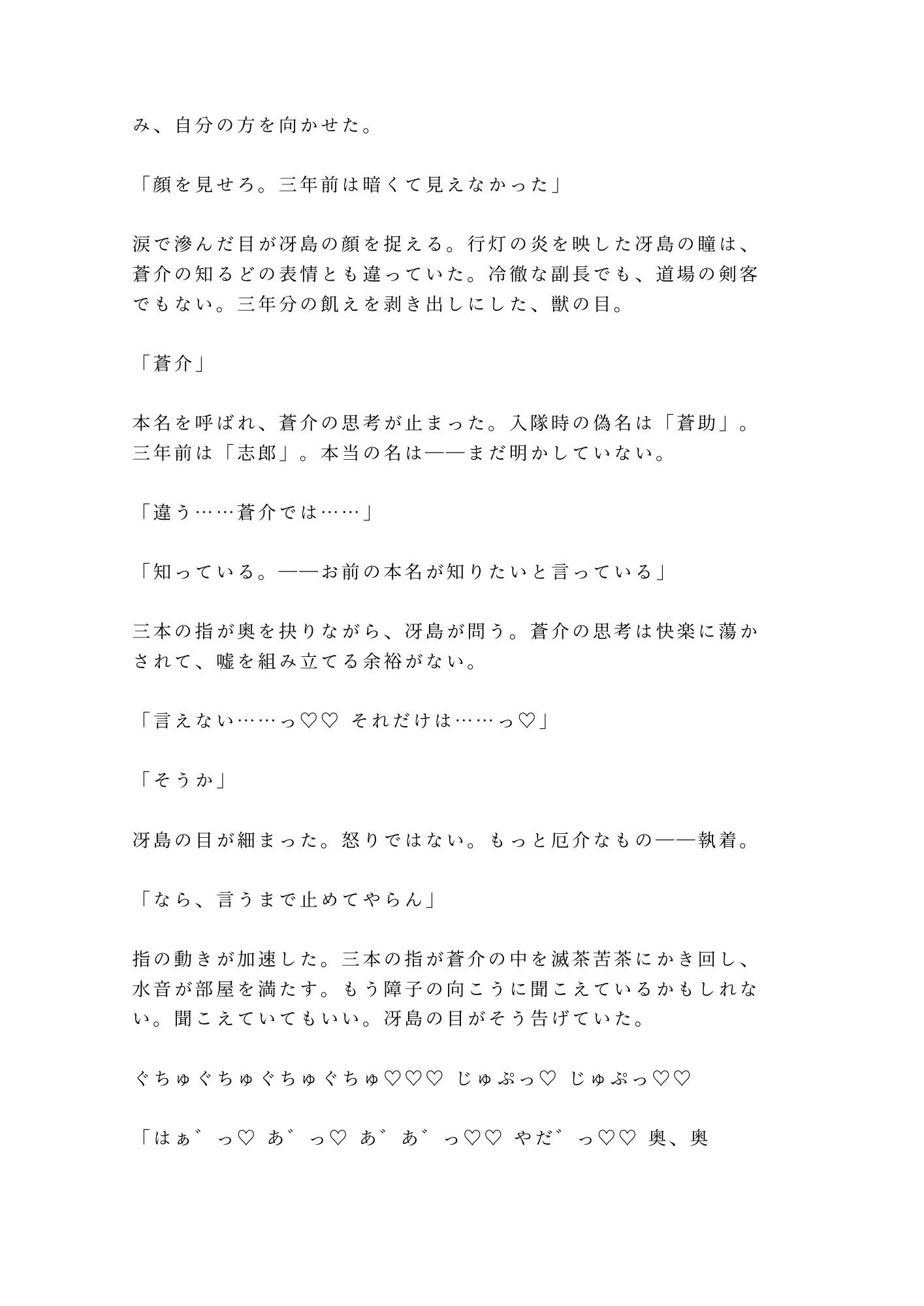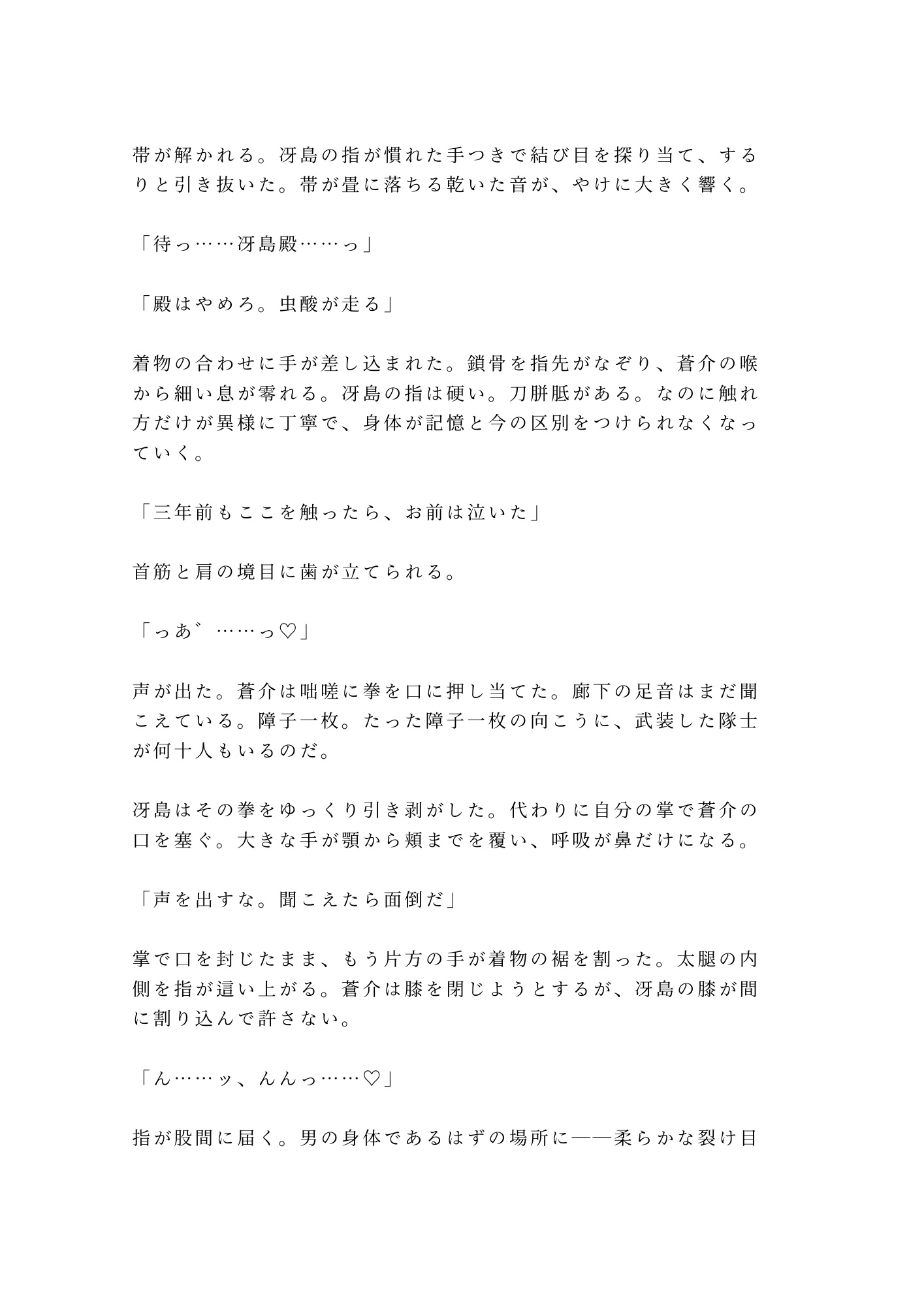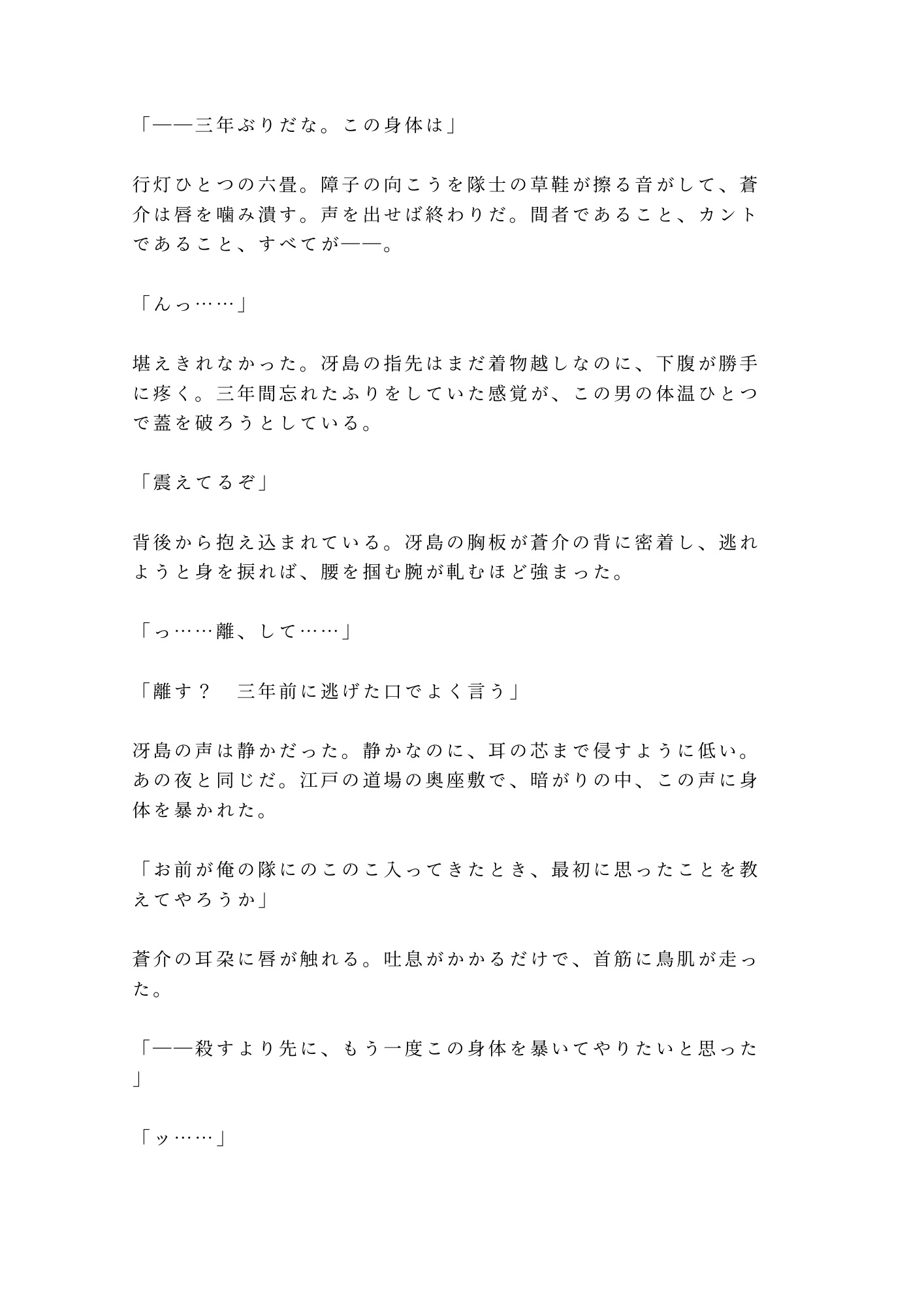 障子一枚の向こうには武装した隊士たち。声を出せば正体が露見し、命はない。逃げることも、抗うことも許されない密室で、冴島は三年分の飢えを隠そうともしない。「三年待った。もう待たん」——その低い声と、刀胼胝のある指先に、蒼介の身体は抵抗を忘れていく。