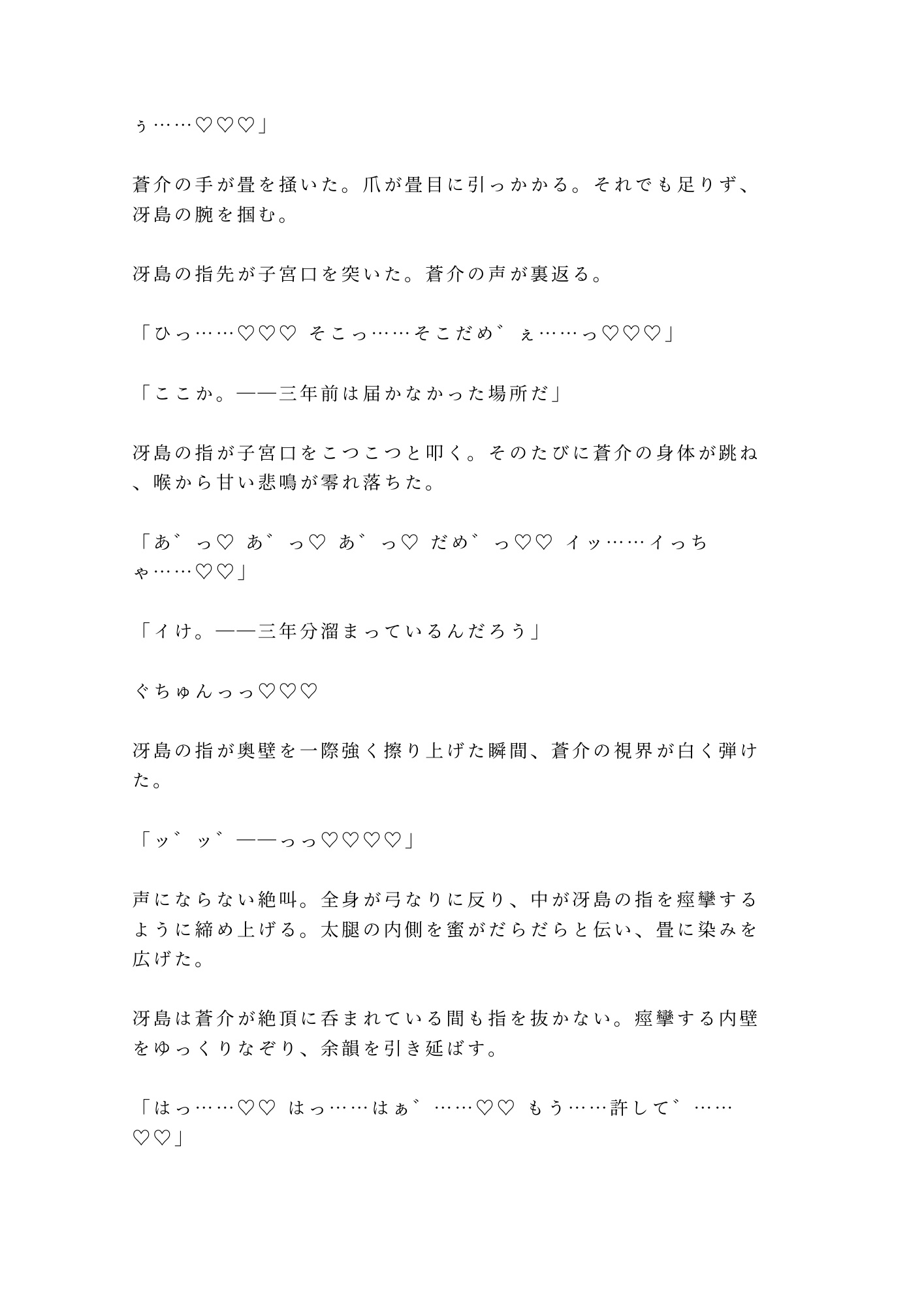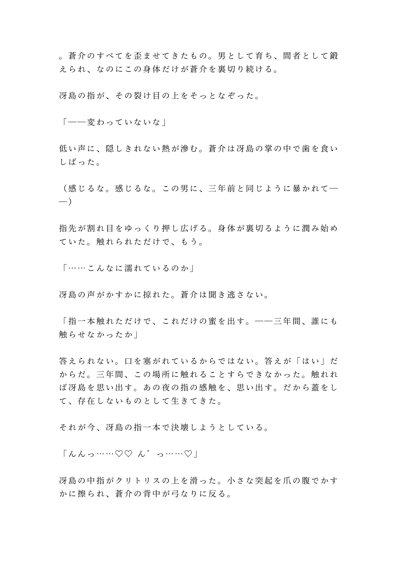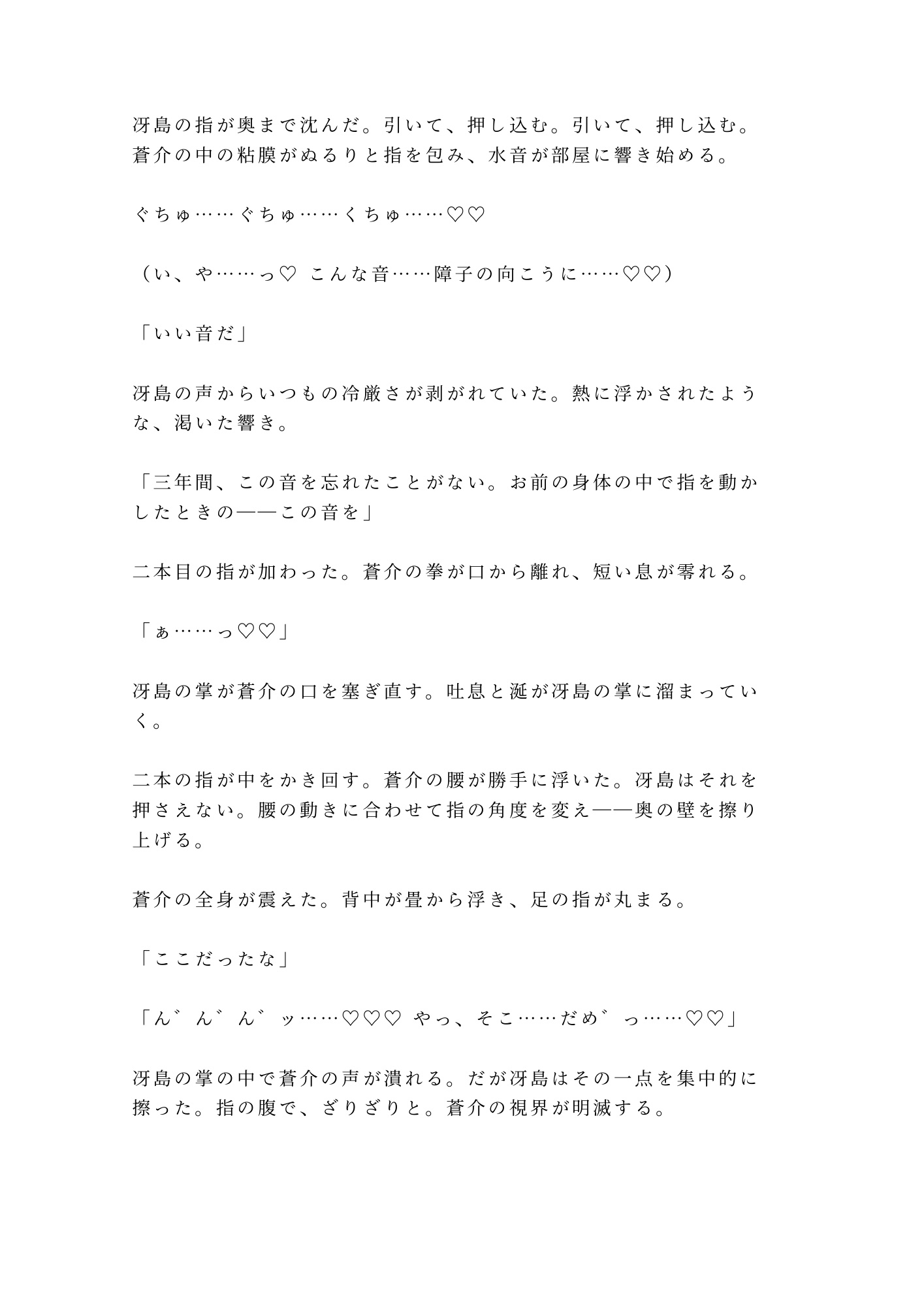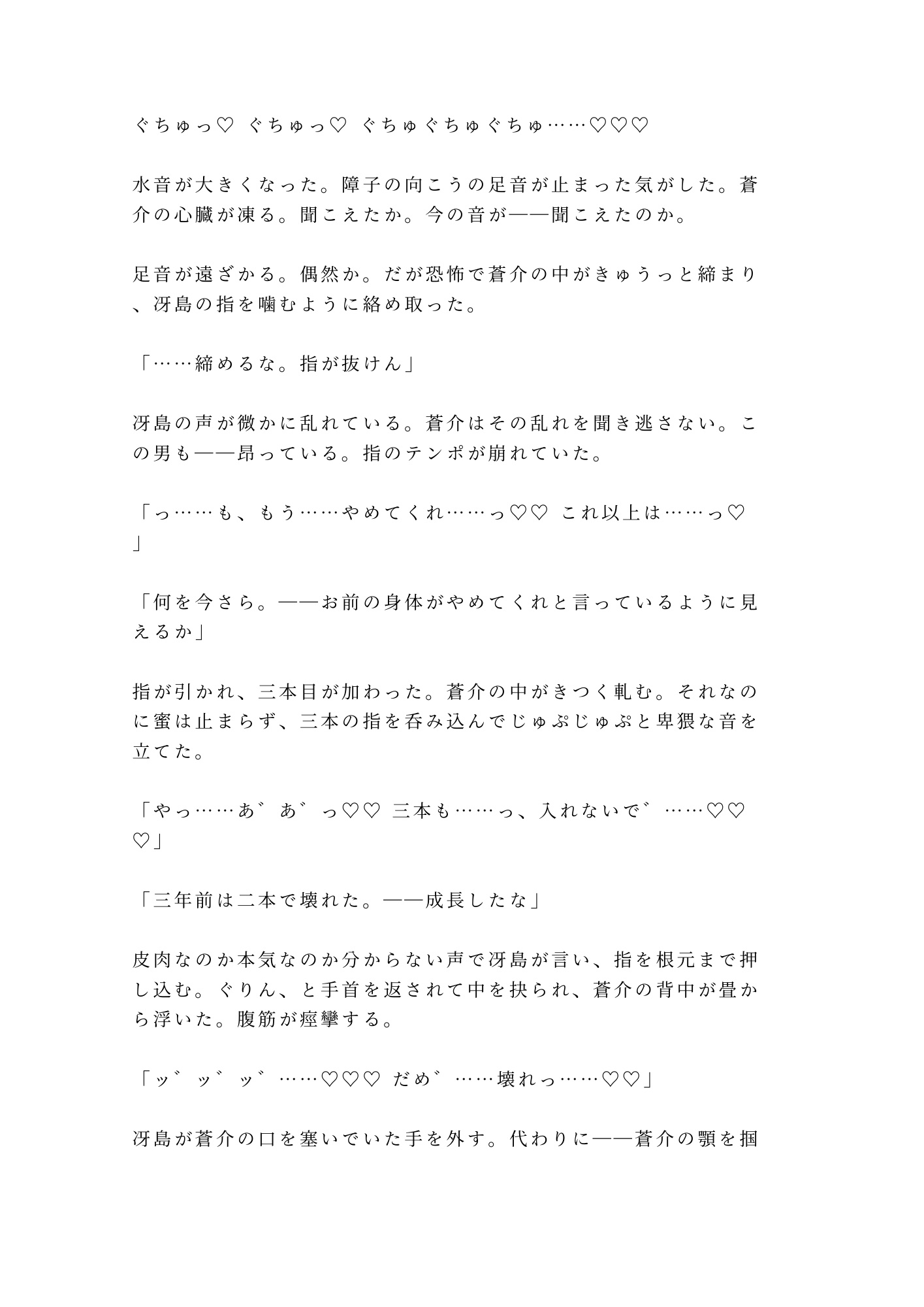 障子一枚の向こうには武装した隊士たち。声を出せば正体が露見し、命はない。逃げることも、抗うことも許されない密室で、冴島は三年分の飢えを隠そうともしない。「三年待った。もう待たん」——その低い声と、刀胼胝のある指先に、蒼介の身体は抵抗を忘れていく。