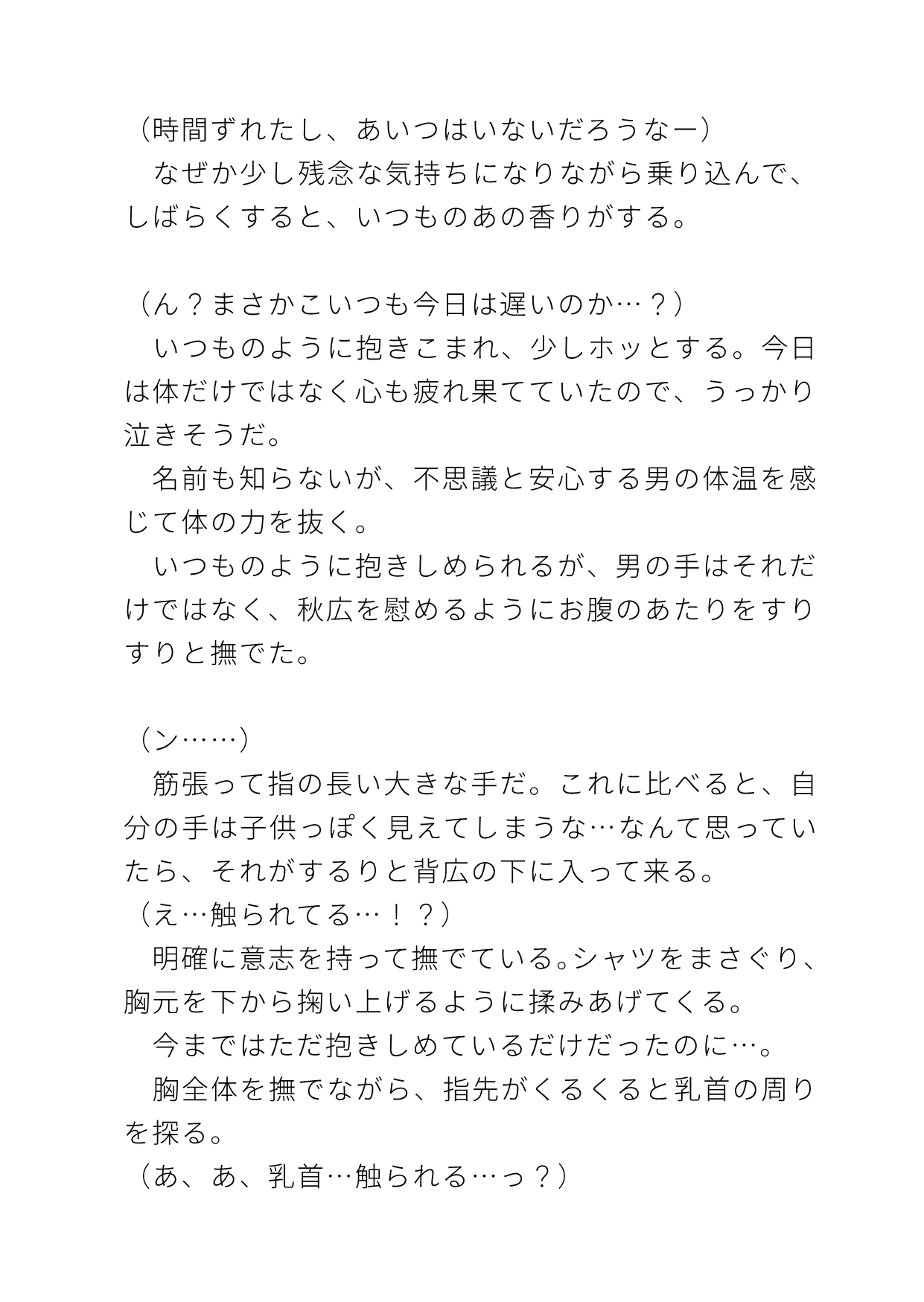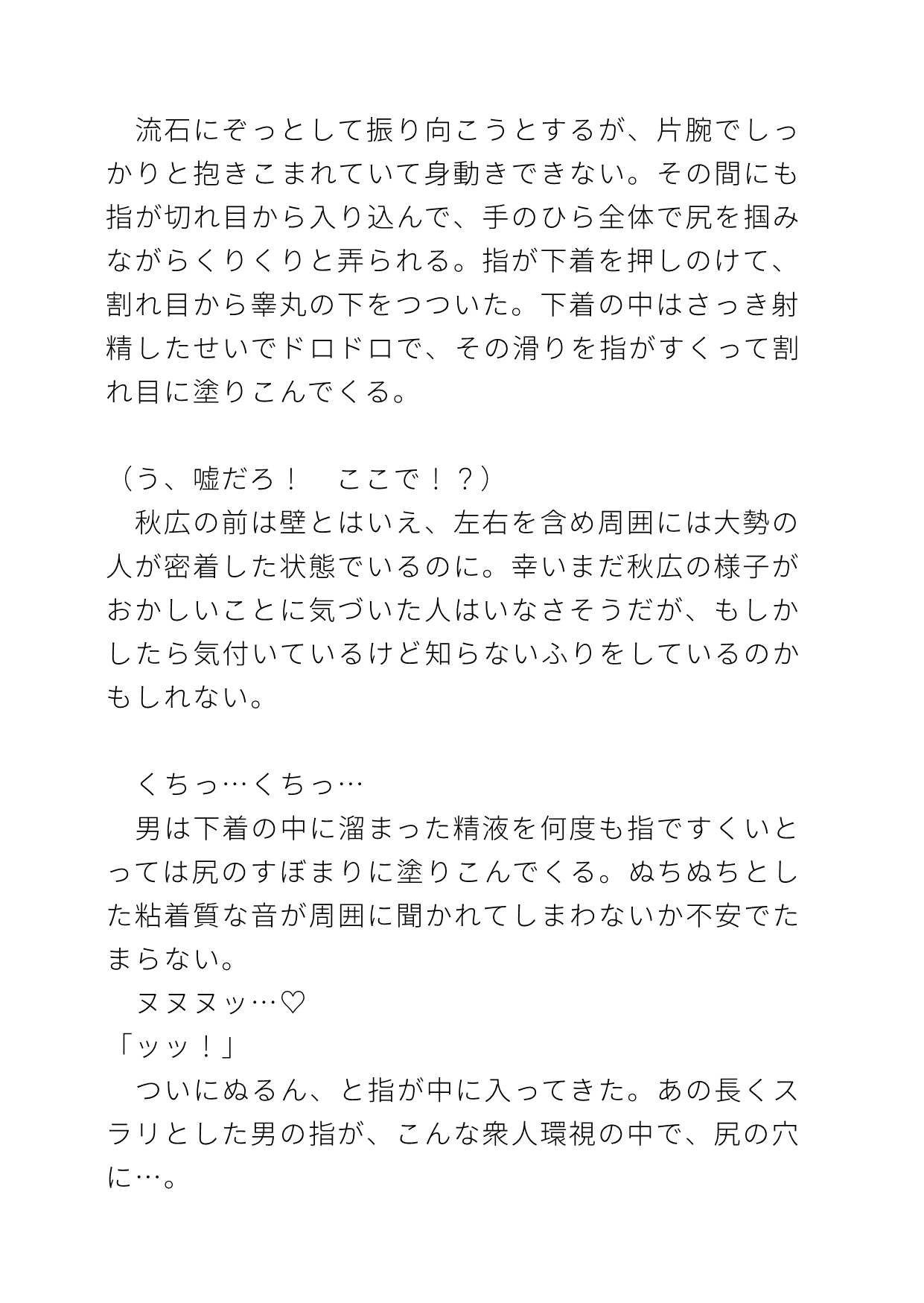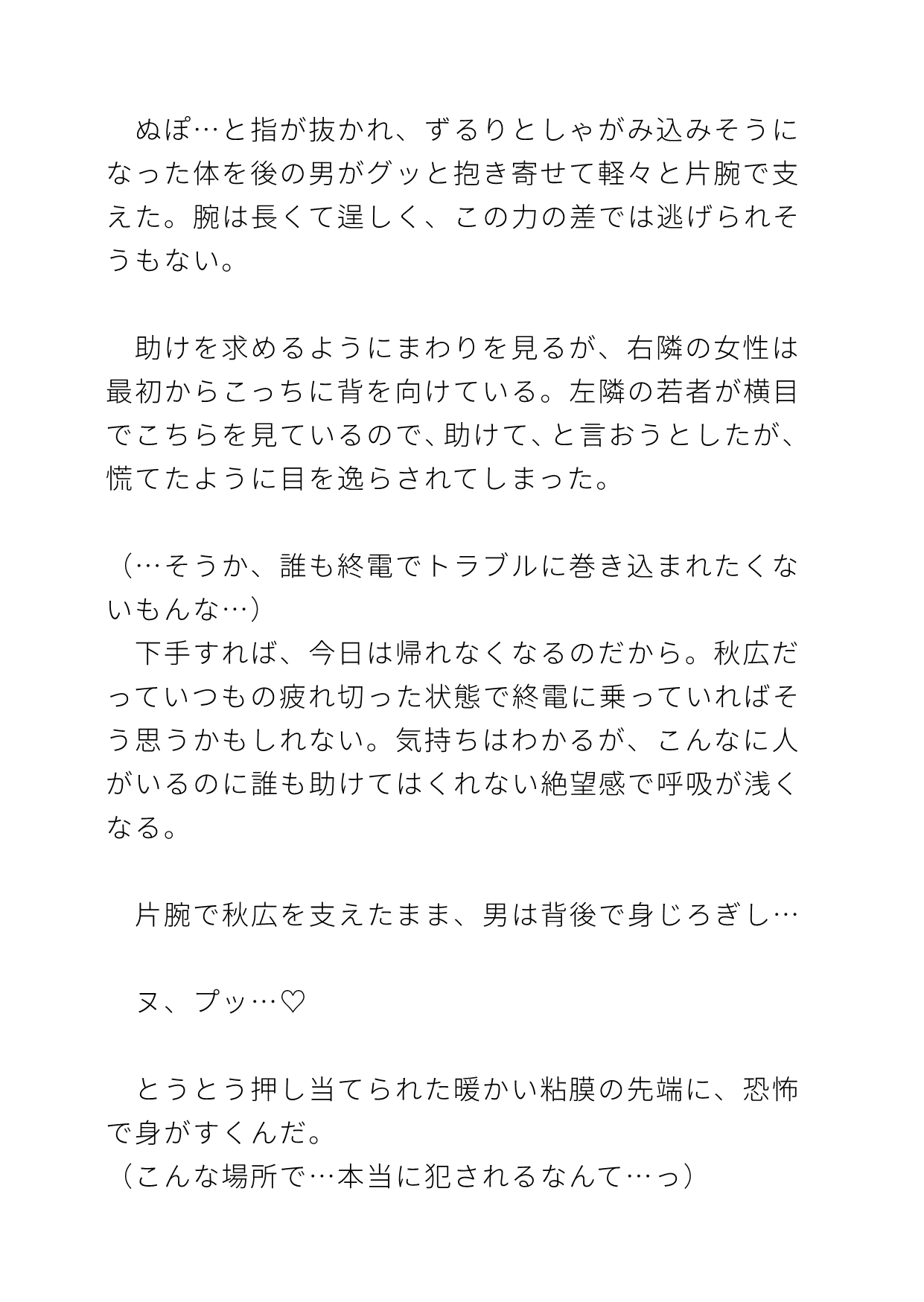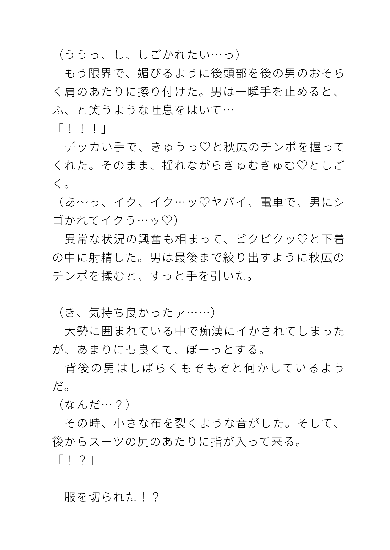 受け…都村秋広(とむらあきひろ)社畜リーマン。平凡タイプなのに突然の電車内非合意立ちバックでイキまくる処女