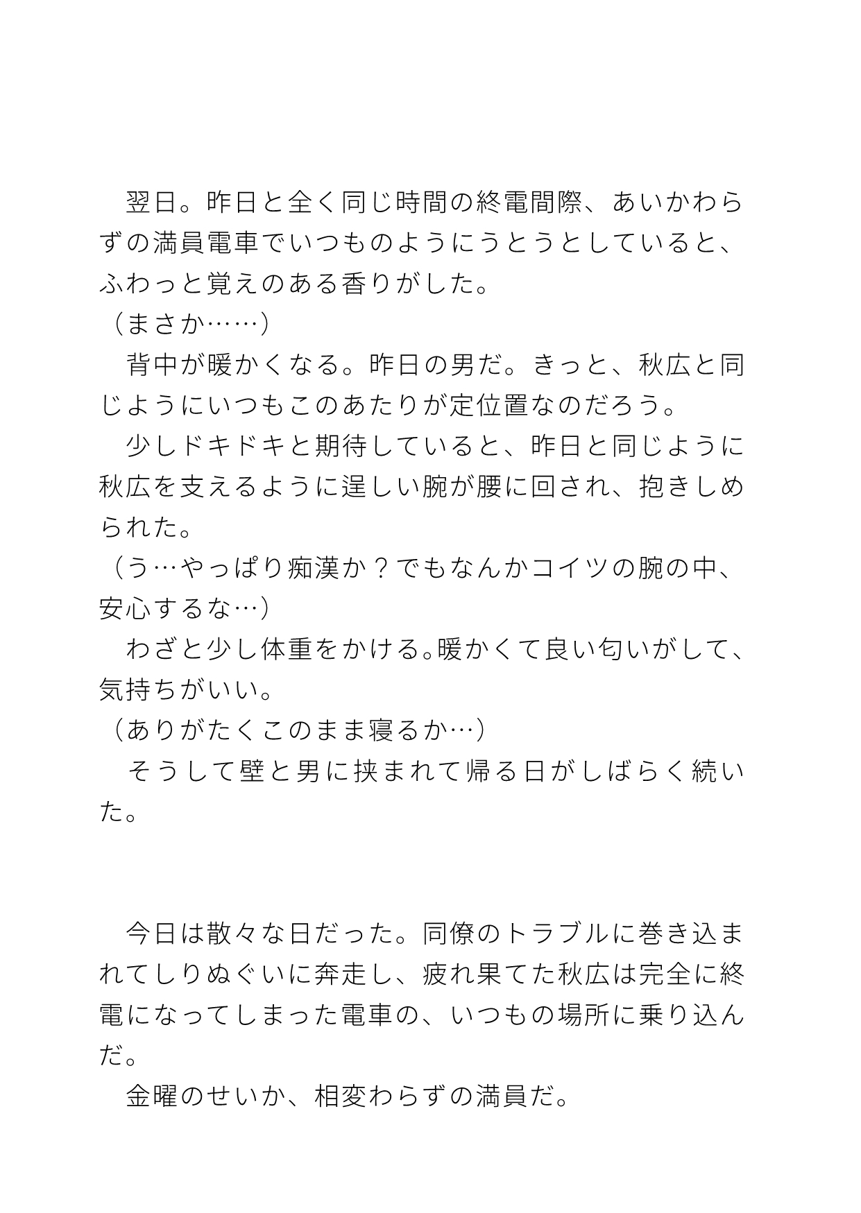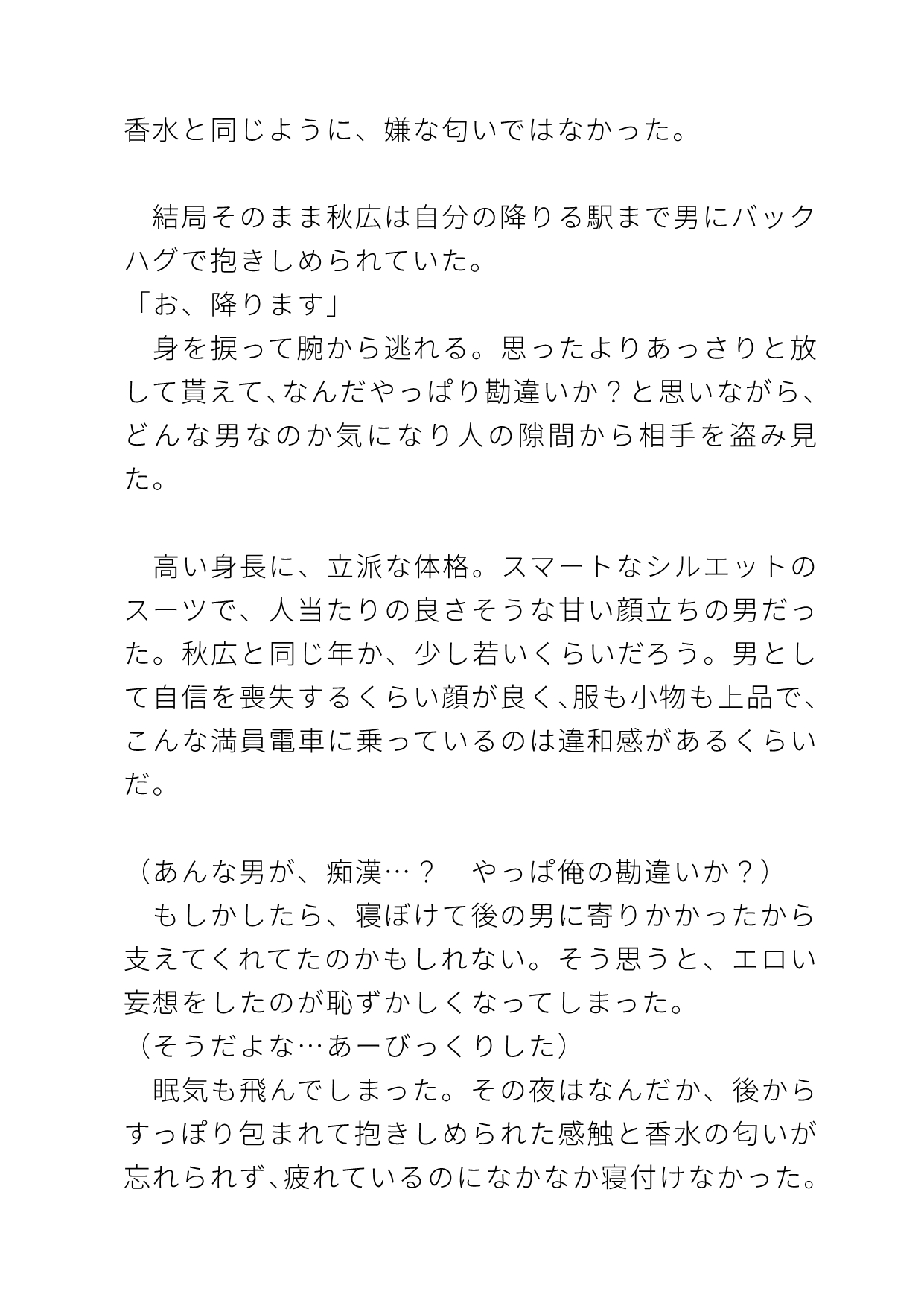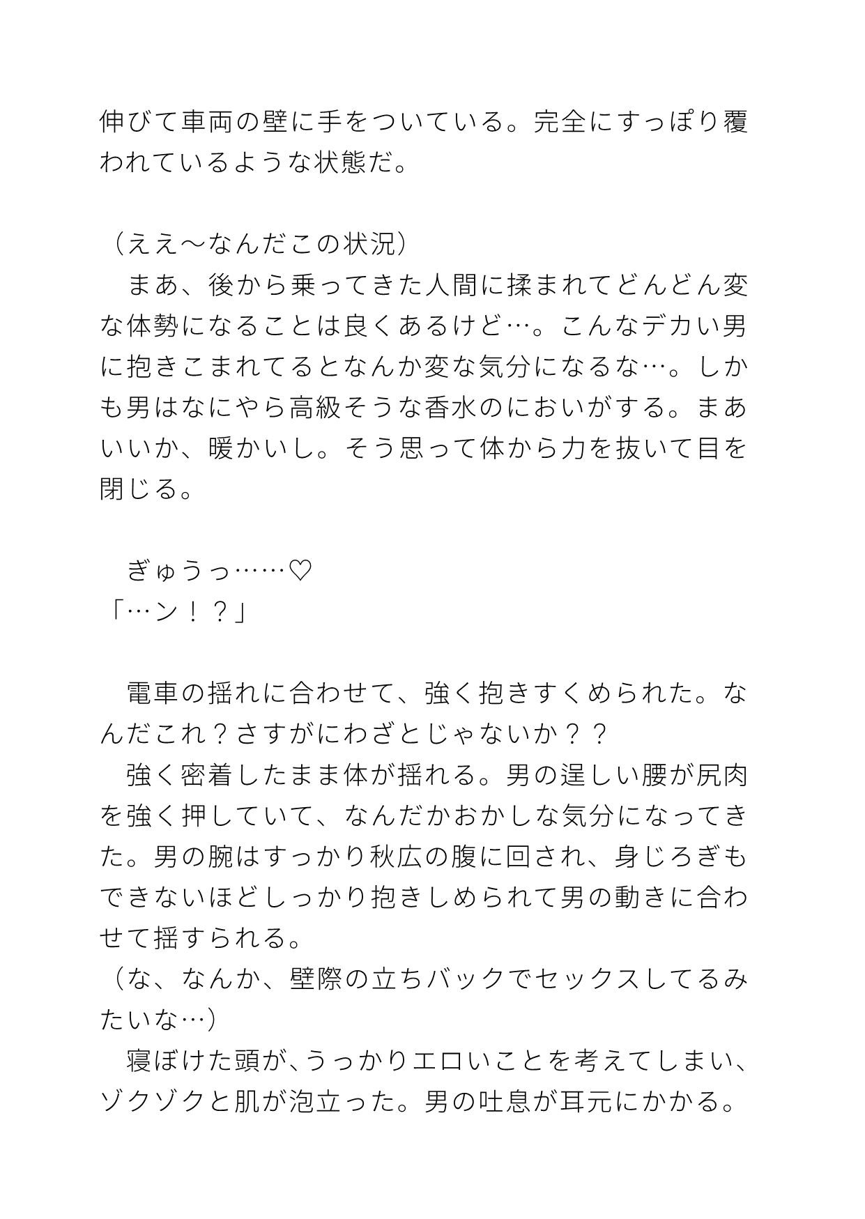 (こんなデカい男に抱きこまれてるとなんか変な気分になるな…)終電間際の満員電車でなんか良い匂いのイケメンにバックハグされてる