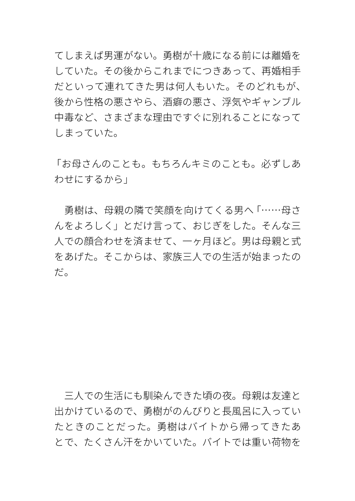 そのときの快感が忘れられない勇樹は、母親のいない間の夜○いを受け入れてしまう。乳首を舐められたり、クンニもされ、太くてかたいもので突かれて、たっぷり中出しされる。