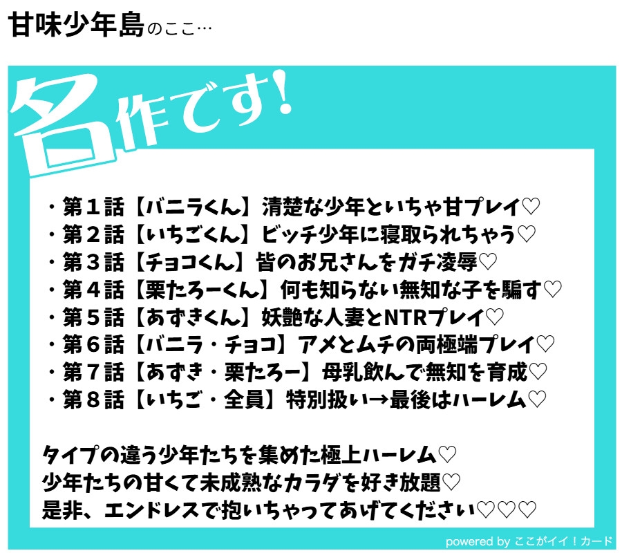 | ジャンル: | オールハッピー / マニアック/変態 / 少年 / ショタ / 快楽堕ち / 純愛 / 常識改変 / やおい / |