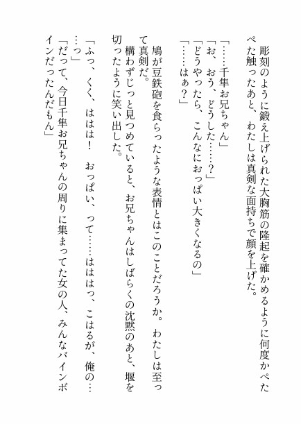 元バスケ部、現ジムトレーナーの、背が高くて格好いい幼馴染の千隼お兄ちゃんがいる、大学生のこはる。そろそろ彼氏が欲しいけれど、どうしてお兄ちゃんのような彼氏がいいと思ってしまう。お兄ちゃんを囲んでいた美女と自分の貧相な身体を比べてしまい、お兄ちゃんに貧乳の相談をしたら「じゃあ、俺が大きくしてやるよ」と言われて……。
