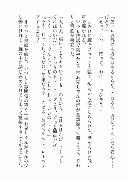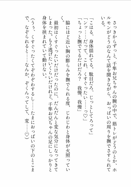 するとお兄ちゃんの手が胸元へと潜り込んで、えっちな育乳トレーニング♡が始まってしまって……。