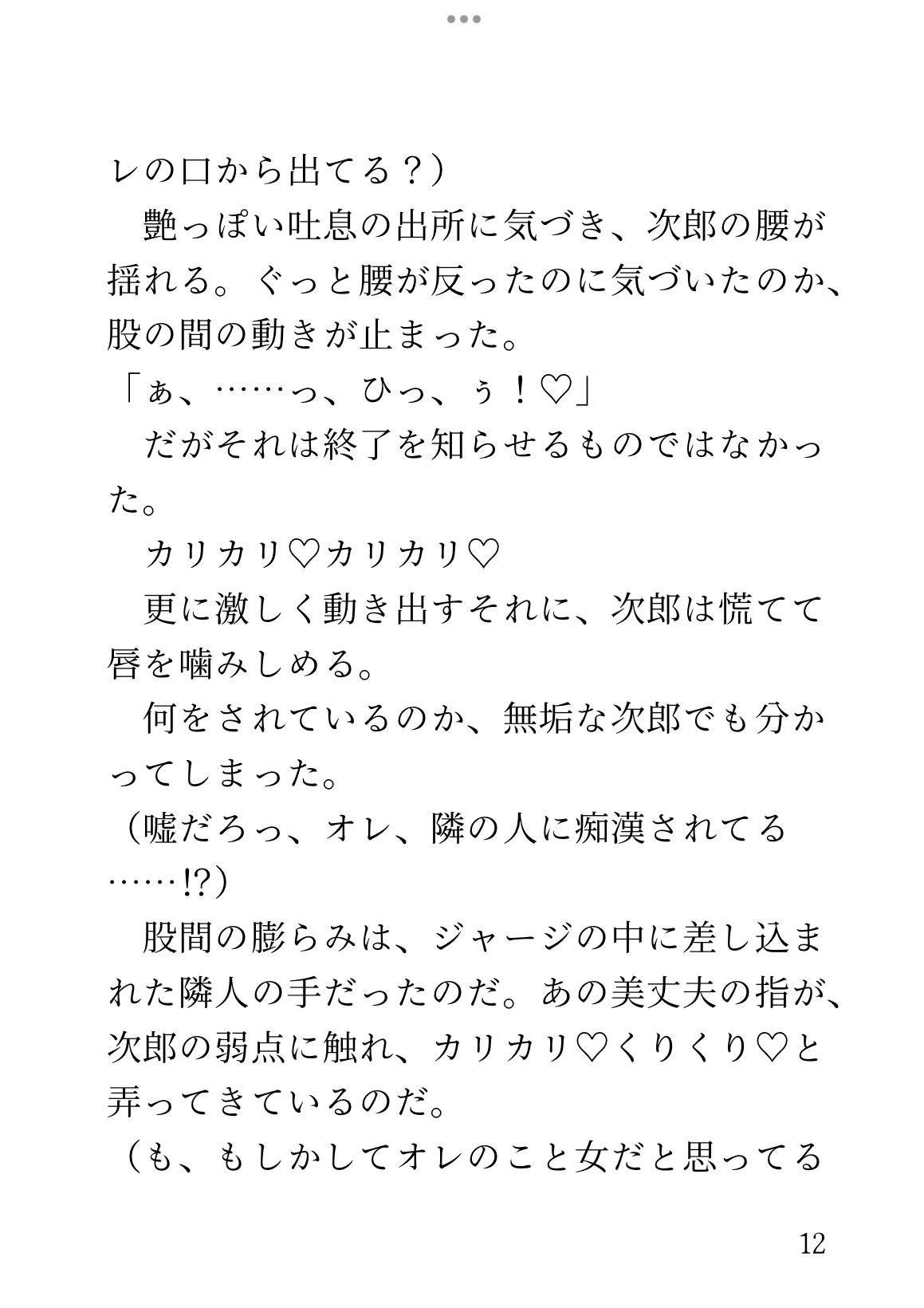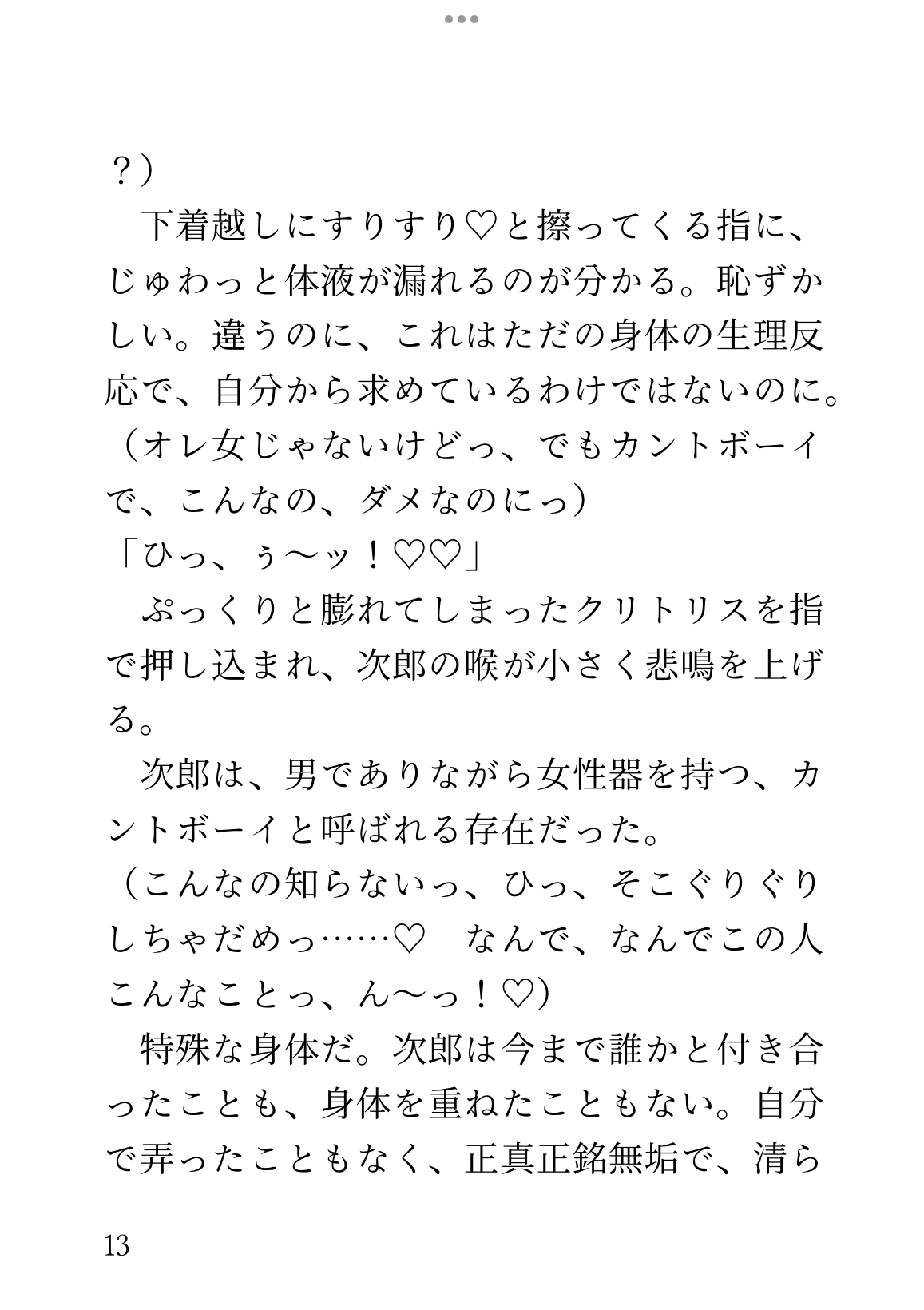 上京のために夜行バスに乗ったカントボーイの次郎は、隣に座る美丈夫の圭一に痴○されてしまう。何も知らない身体をじっくり開かれ、大きすぎる快感を植え付けられていく。