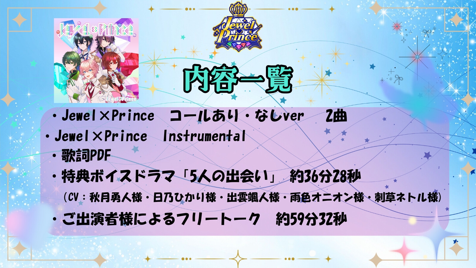 「Jewel×Prince (CV:秋月勇人様・日乃ひかり様・出雲颯人様・雨色オニオン様・刺草ネトル様)」のFANZA価格データはありません