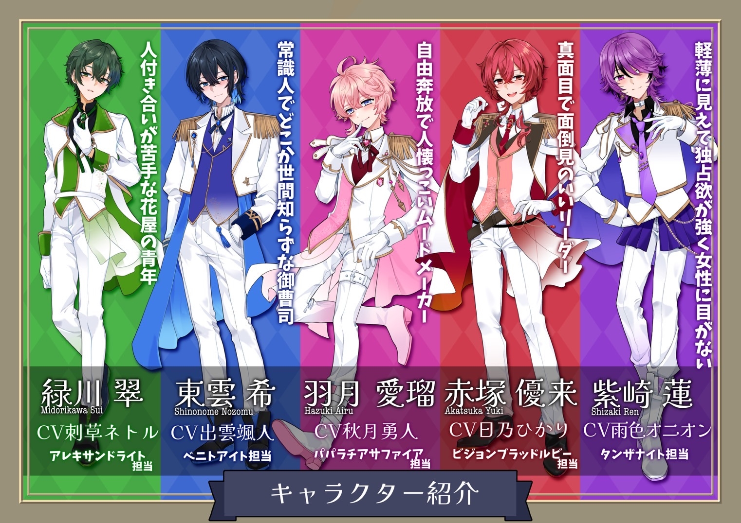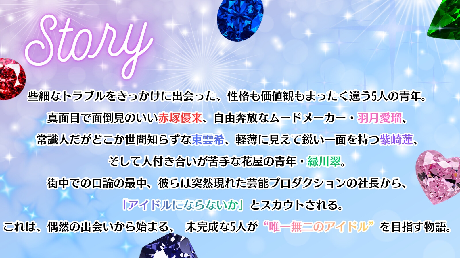 些細なトラブルをきっかけに出会った、性格も価値観もまったく違う5人の青年。 真面目で面倒見のいい赤塚優来、自由奔放なムードメーカー・羽月愛瑠、 常識人だがどこか世間知らずな東雲希、軽薄に見えて鋭い一面を持つ紫崎蓮、 そして人付き合いが苦手な花屋の青年・緑川翠。 彼らは突然現れた芸能プロダクションの社長から 「アイドルにならないか」とスカウトされる。 これは、 未完成な5人が“唯一無二のアイドル”を目指す物語。