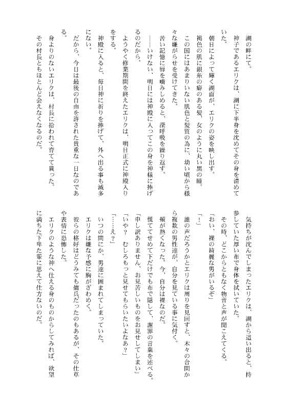 一人前の神子になる為に修業中のエリクは、湖で身を清めていた時、傭兵の集団に襲われる。