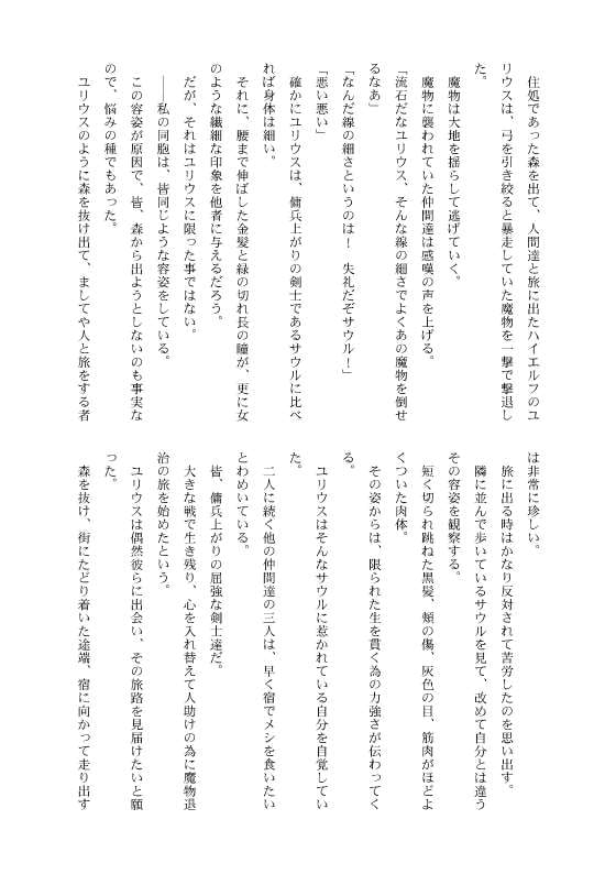 剣士サウルとその仲間達と共に旅を続けるハイエルフのユリウスは、彼らと快楽を共有することに悦びを感じていた。